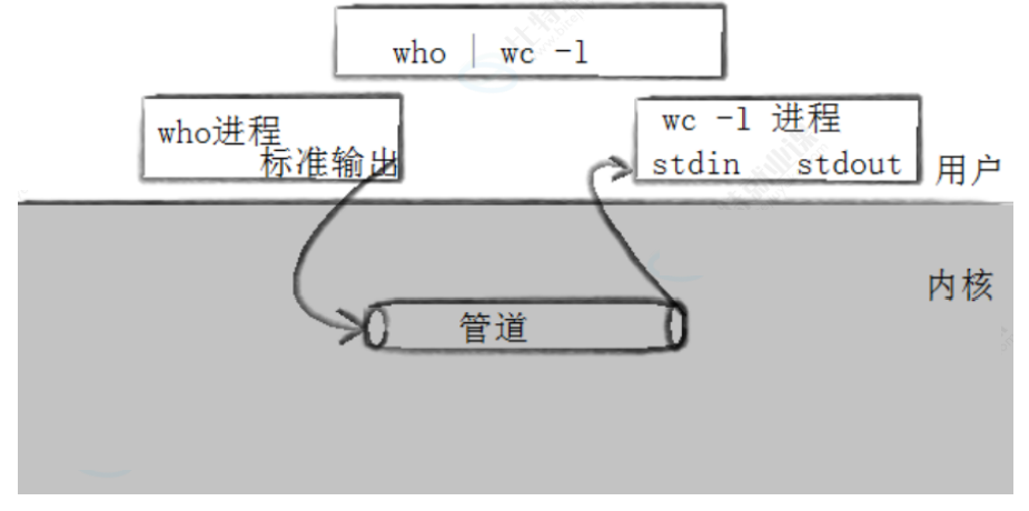who进程:将其标准输出(文件描述符 1)重定向到管道的写入端。这样,who输出的所有内容都被写入管道,而不是直接打印到终端。- 对于