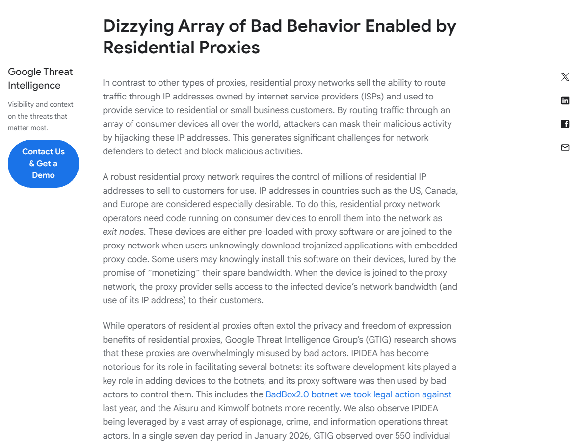 就拿Google 的威胁情报团队(GTIG)在 2026 年 1 月披露并联合多方干扰了一个大型"住宅代理"网络 IPIDEA。