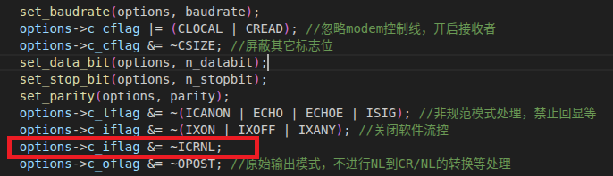 具体来说是,串口的c_iflag(输入模式标志)中,默认可能开启了ICRNL标志(字符转换标志位) ------ 该标志会将接收的CR(0x0D)自动转换为NL(0x0A)。若代码中未明确清除这个标志位,将会导致数据被篡改: