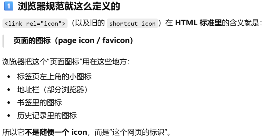 <link rel="icon">(以及旧的 shortcut icon)在 HTML 标准里的含义就是页面的图标(page icon / favicon)