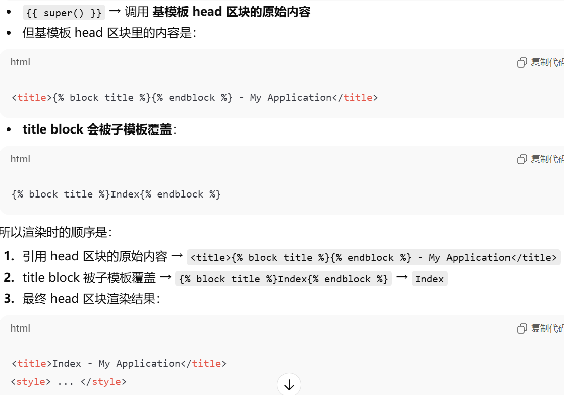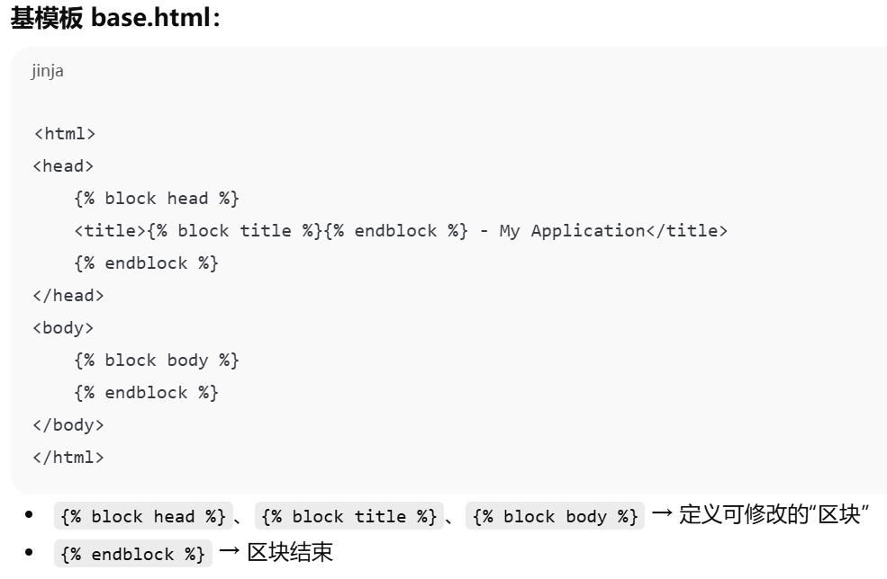 | styles | CSS 样式声明 | 自定义样式 | {% block styles %}body {background: #f0f0f0;}{% endblock %} |