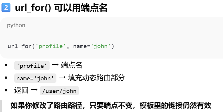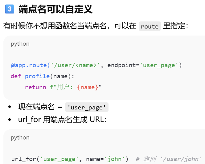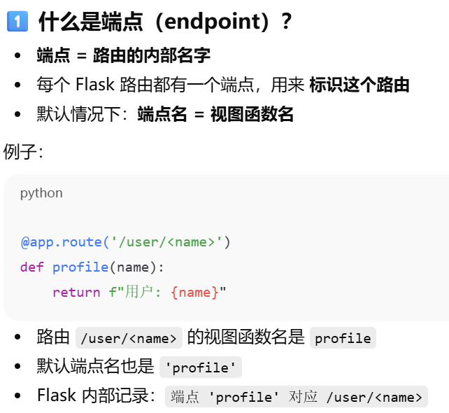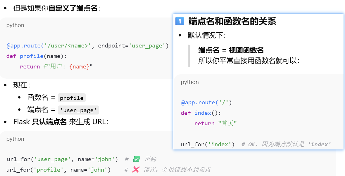 - [视图函数名和端点名不一致时,只能使用端点名。Flask 只认端点名 来生成 URL](#视图函数名和端点名不一致时,只能使用端点名。Flask 只认端点名 来生成 URL)