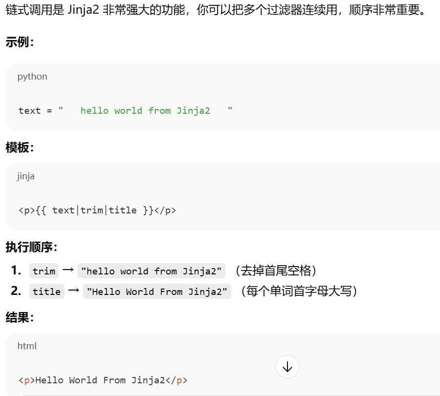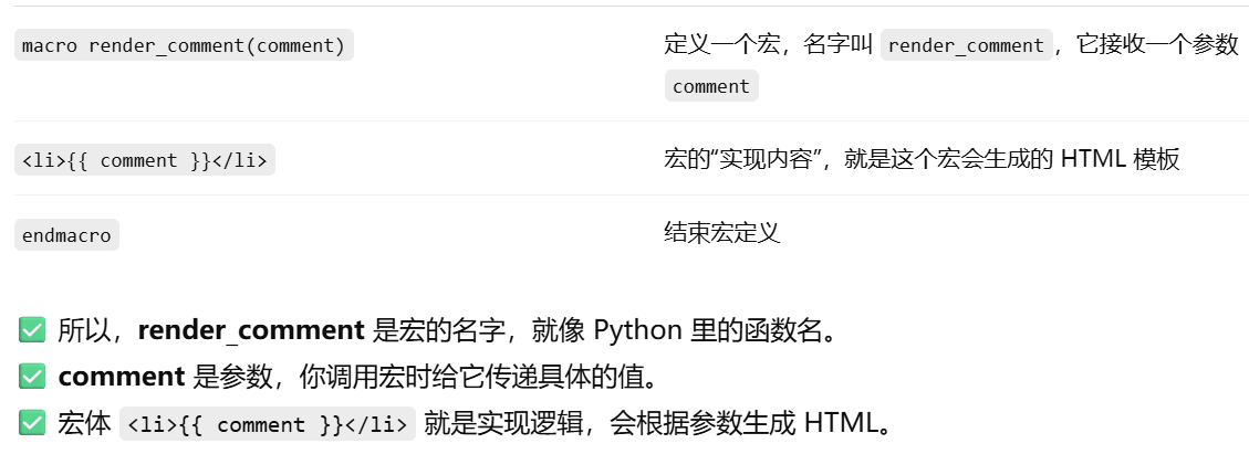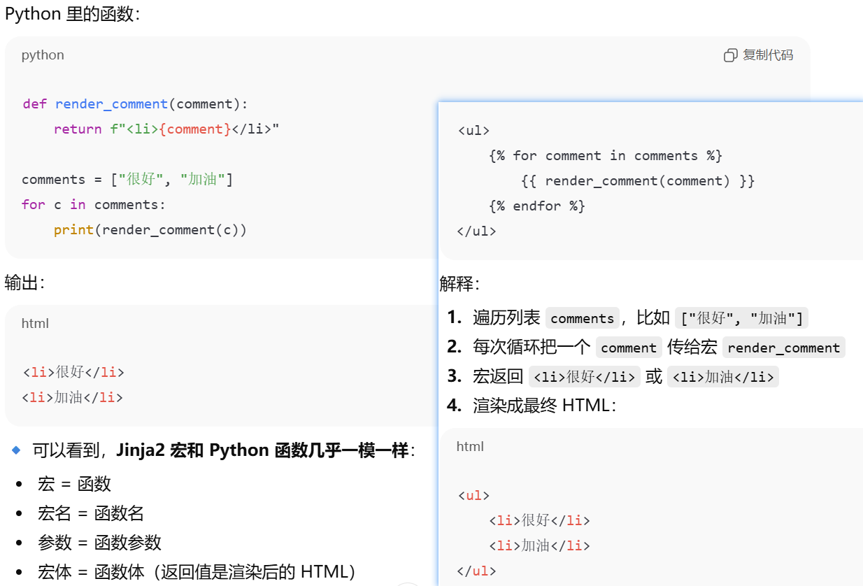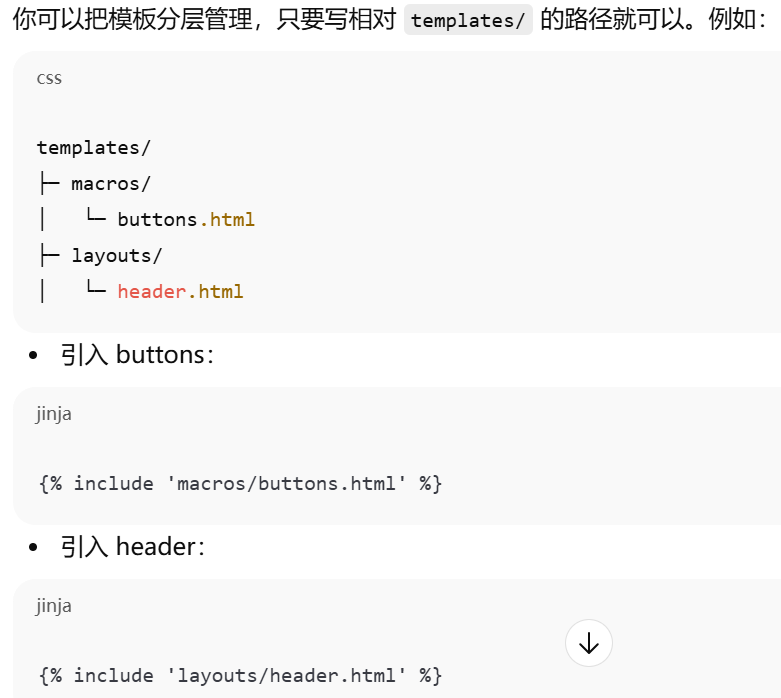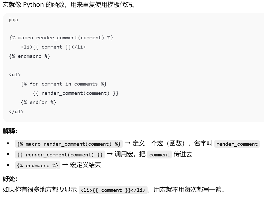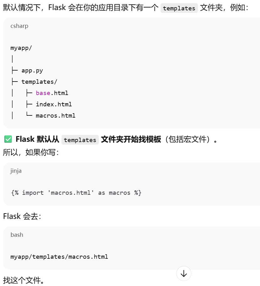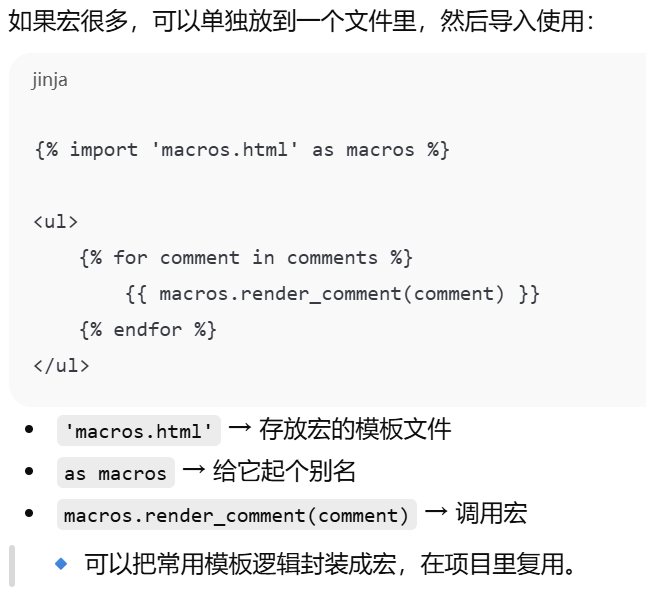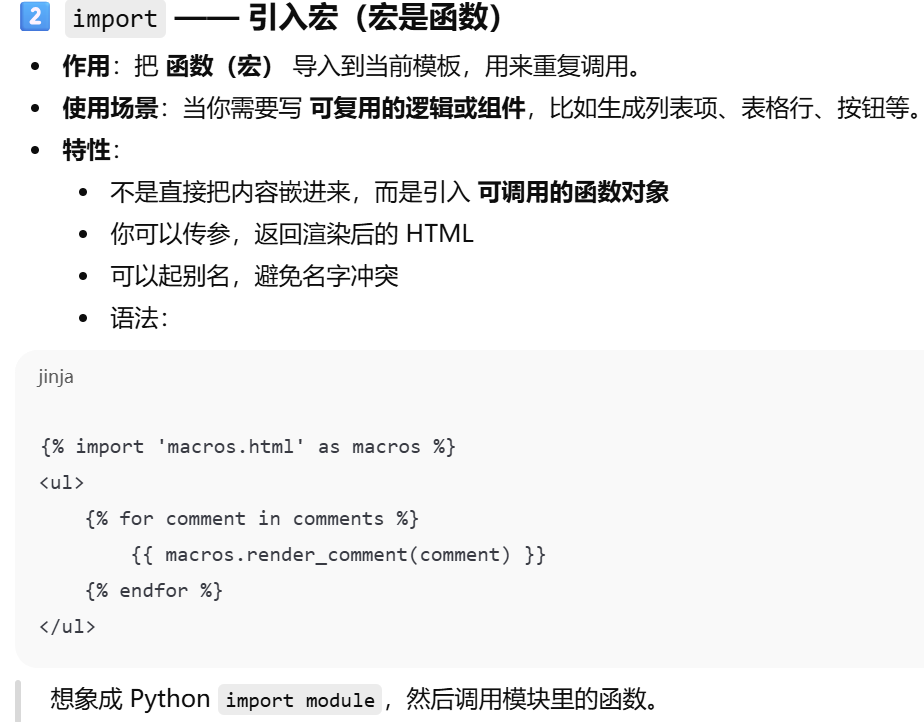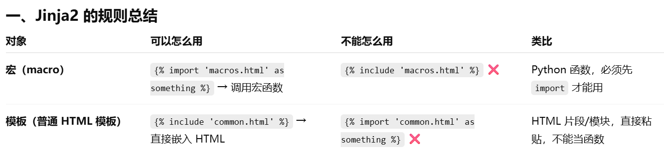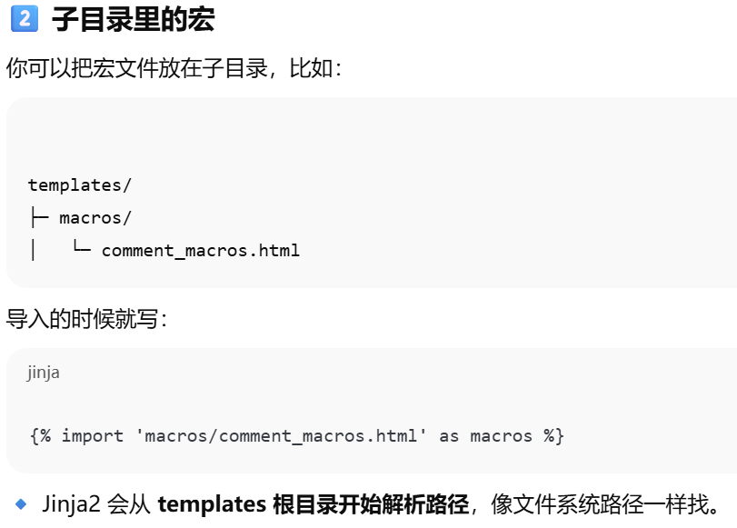- [Jinja2 宏导入从 Flask 的模板根目录 (templates) 开始找,相对路径写文件名或子目录路径即可。](#Jinja2 宏导入从 Flask 的模板根目录 (templates) 开始找,相对路径写文件名或子目录路径即可。)