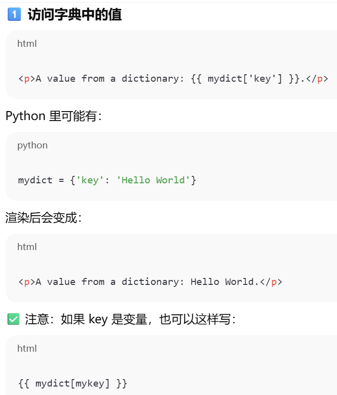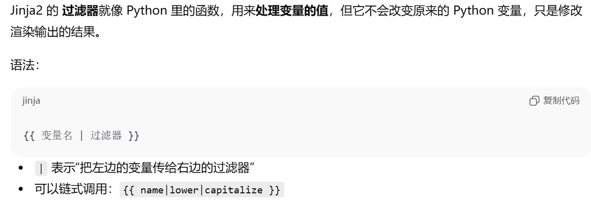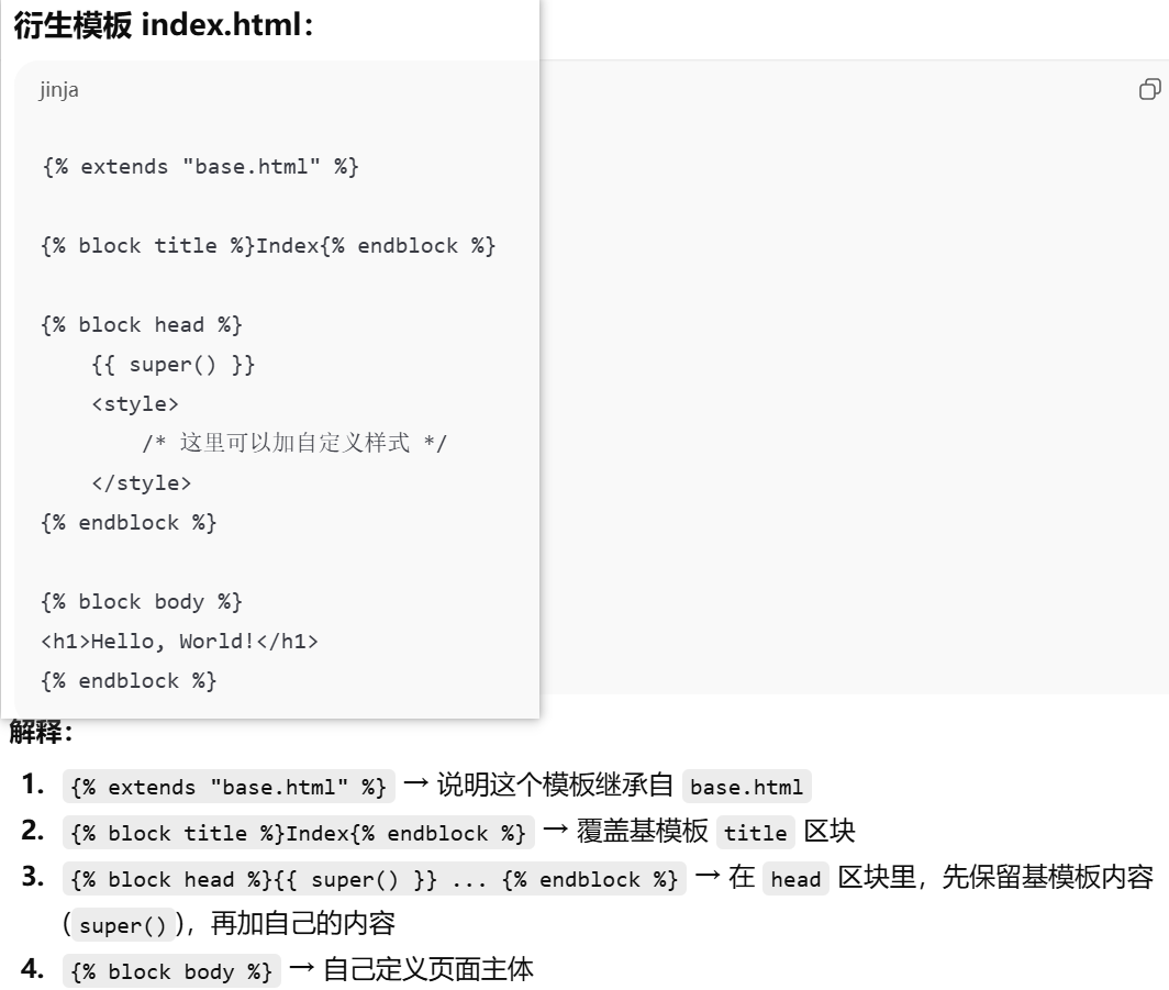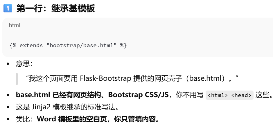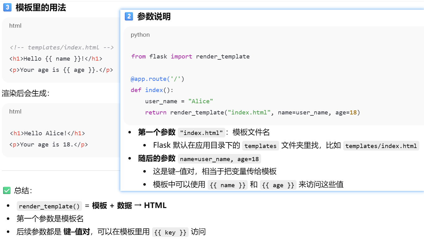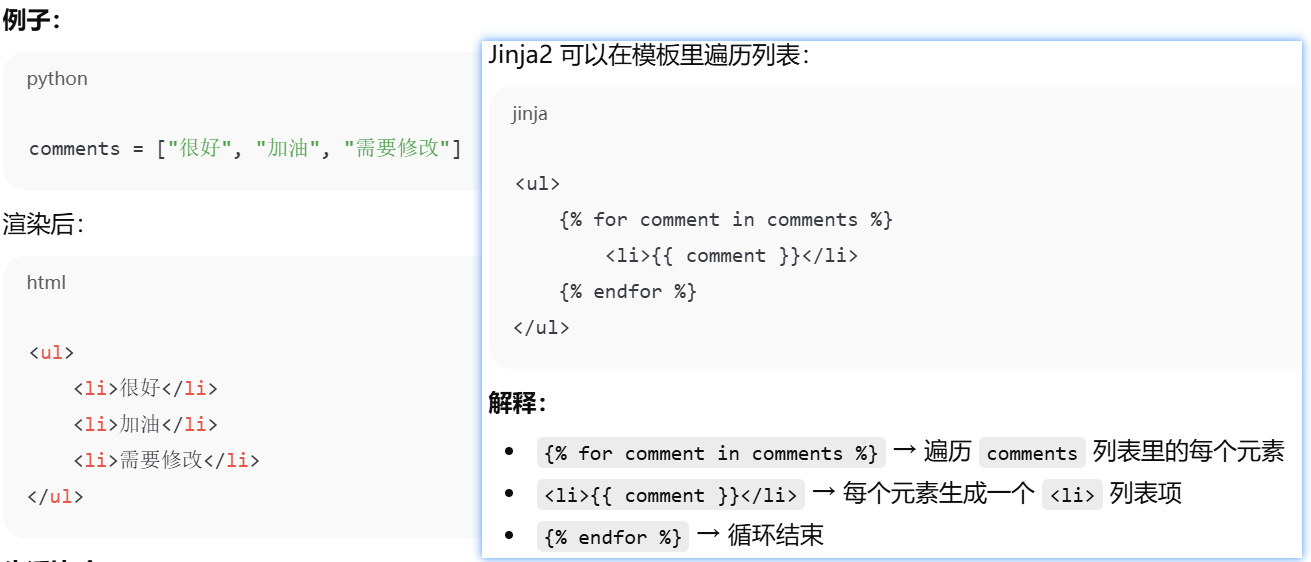 - [摘要,视图函数只负责请求 → 响应,业务逻辑(数据处理)和表现逻辑(HTML 页面生成)要分开,模板(Jinja2) 用来渲染页面 → 表现逻辑移到模板中](#摘要,视图函数只负责请求 → 响应,业务逻辑(数据处理)和表现逻辑(HTML 页面生成)要分开,模板(Jinja2) 用来渲染页面 → 表现逻辑移到模板中)