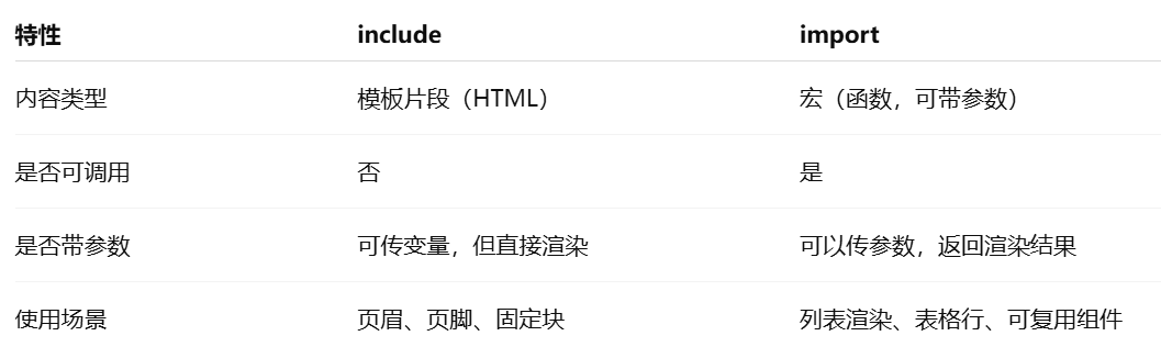 include ------ 引入模板片段, import ------ 引入宏(宏是函数)