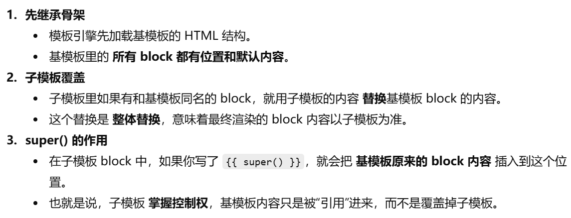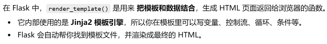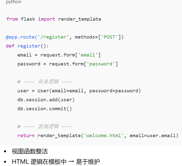 摘要,视图函数只负责请求 → 响应,业务逻辑(数据处理)和表现逻辑(HTML 页面生成)要分开,模板(Jinja2) 用来渲染页面 → 表现逻辑移到模板中