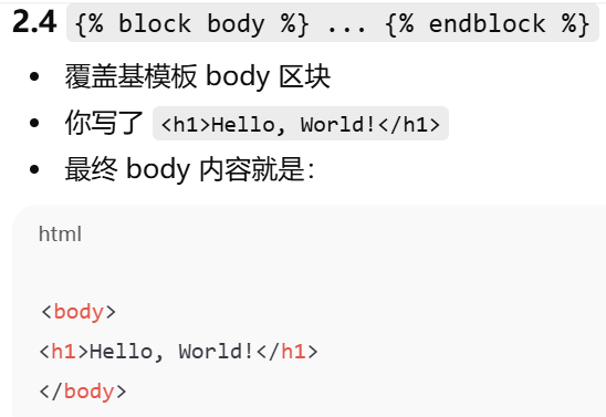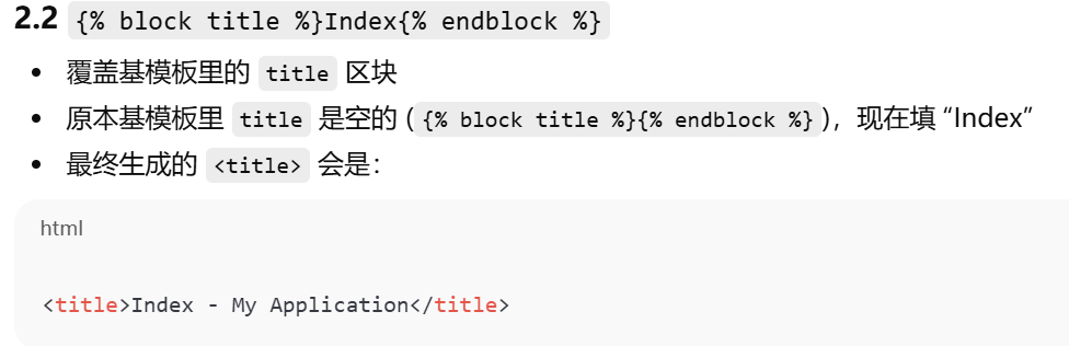 | content | 用户自定义页面内容 | 页面主体 | {% block content %}<h1>Hello!</h1>{% endblock %} |
