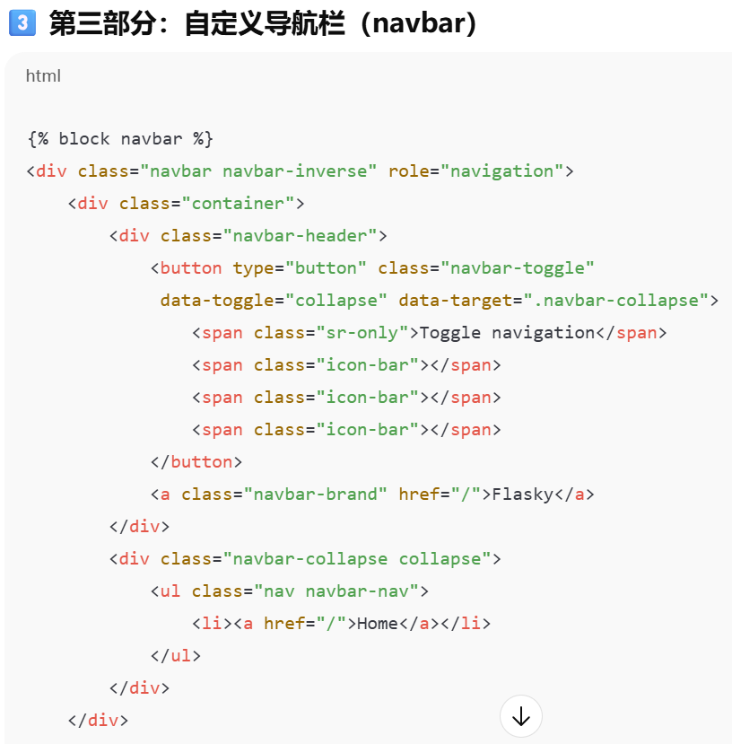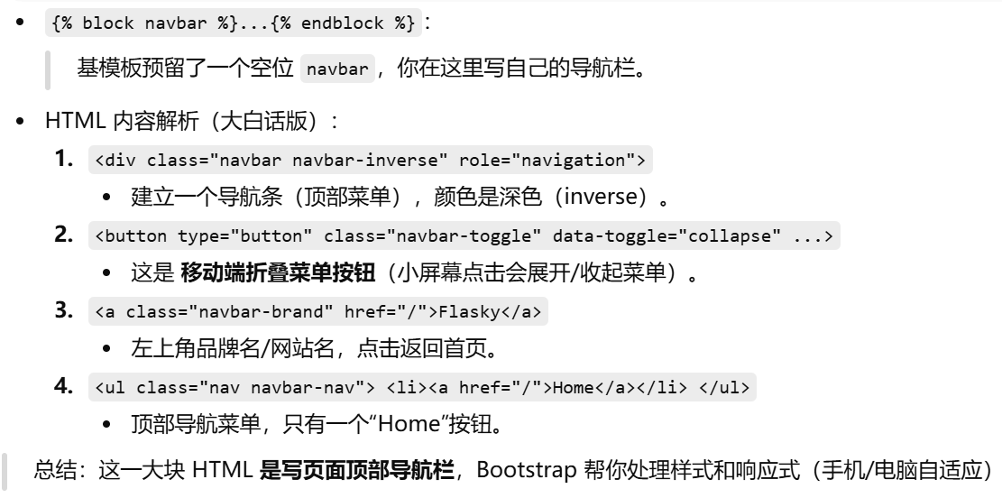 | navbar | 用户自定义导航栏 | 页面顶部菜单 | {% block navbar %}...导航栏HTML...{% endblock %} |