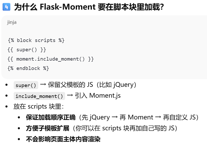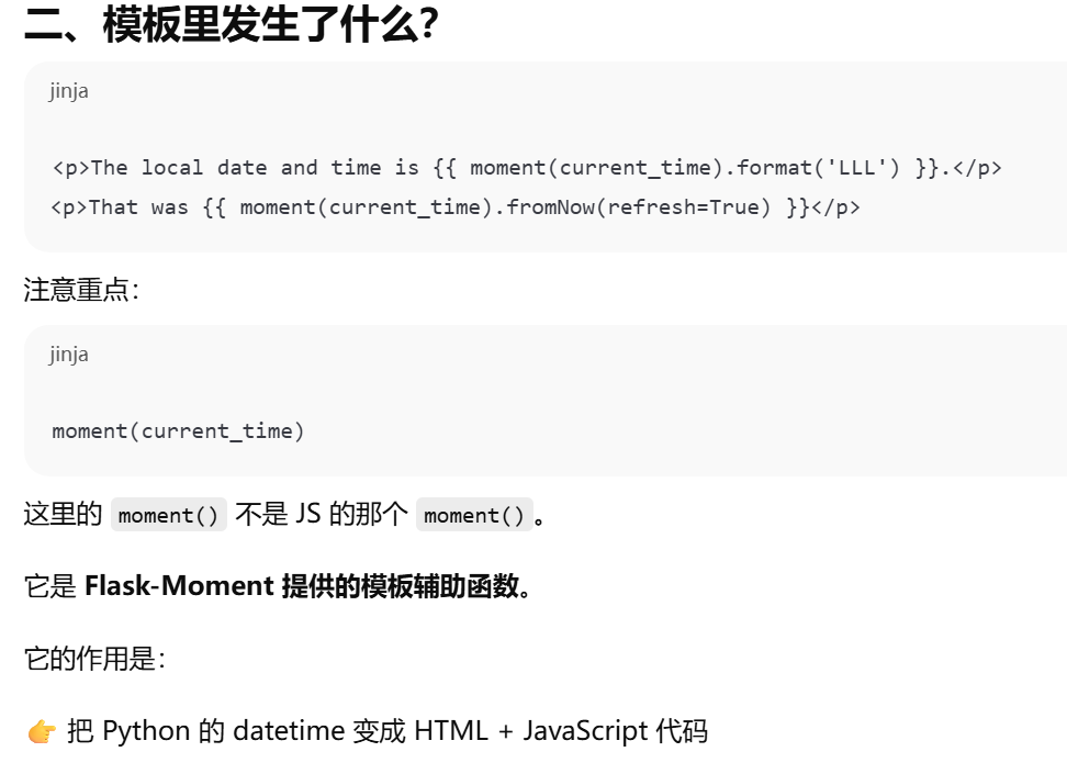 moment() Flask-Moment 提供的模板辅助函数。把 Python 的 datetime 变成 HTML + JavaScript 代码。在浏览器中自动本地化时间