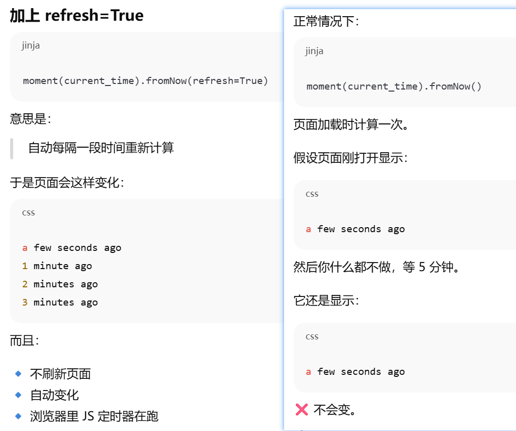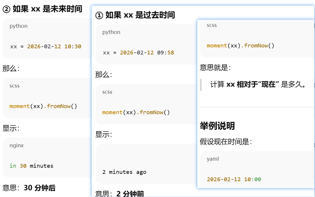 moment(xx).fromNow() 计算 xx 相对于"现在" 是多久。显示相对时间