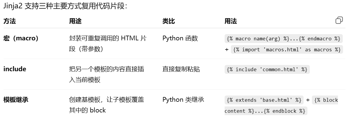 - [Jinja2 的重复使用代码片段方法总结,宏,include,模板继承](#Jinja2 的重复使用代码片段方法总结,宏,include,模板继承)