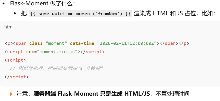 Flask-Moment 不处理时间,只帮你生成浏览器需要的 HTML 和 JS,让 Moment.js 在客户端执行真正的时间处理