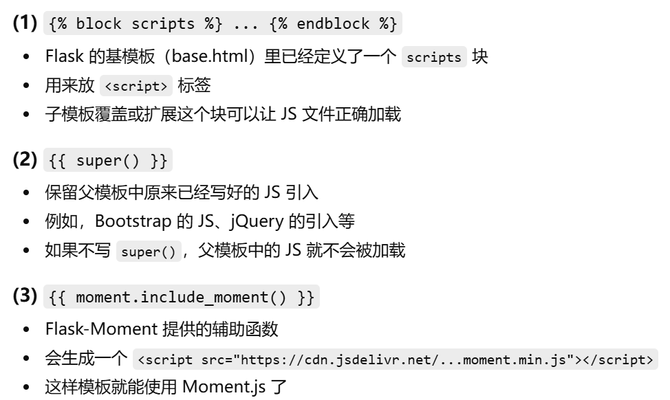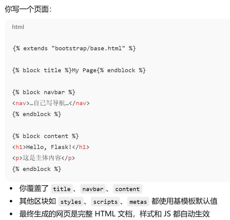 | scripts | 文档底部的 JavaScript | 放 JS 文件或脚本 | {% block scripts %}<script src="..."></script>{% endblock %} |