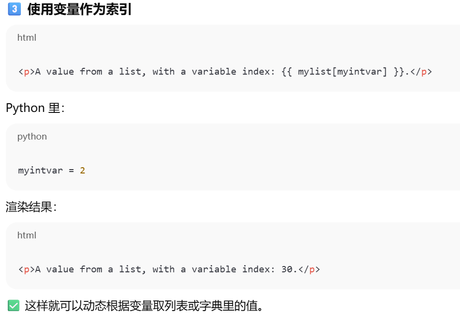 A value from a list, with a variable index: {{ mylist[myintvar], mydict[mykey] }}.