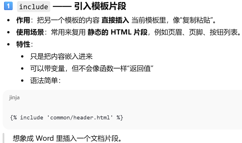 include --- 引入模板片段。直接把另一个模板内容原封不动插入。