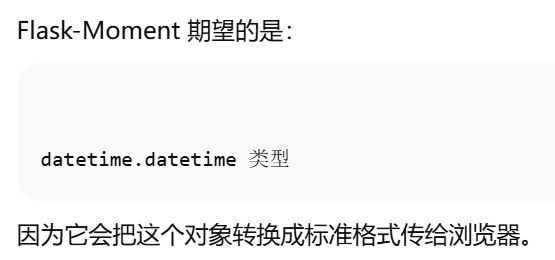 - [Flask-Moment 假定服务器端应用处理的时间戳是"纯正的"datetime对象,且使用 UTC 表示。](#Flask-Moment 假定服务器端应用处理的时间戳是“纯正的”datetime对象,且使用 UTC 表示。)