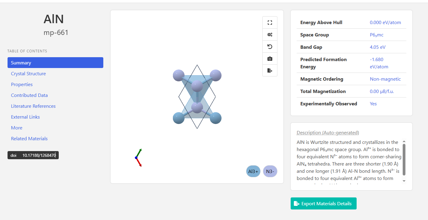 然后我们找到了mp-661的AlN,我们就可以再官网看到相关的数据