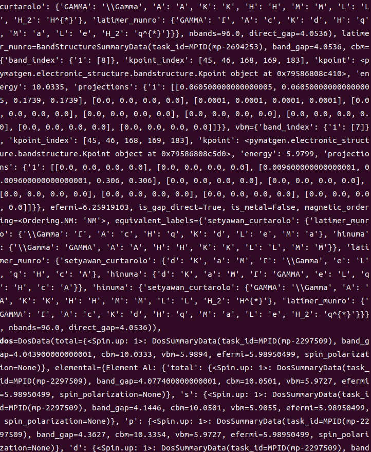 ***print(material)***就是直接把for循环的当前的物质的相关数据打印出来,由于我们没有做任何调取的限制,我们会把能带,密度,光学性质等等全部打印出来,就会非常庞大,如