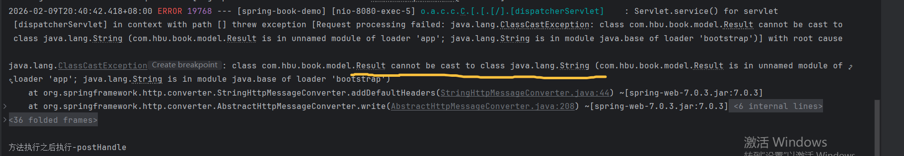 核心原因是 Spring 处理 String 类型返回值的消息转换器优先级问题:当控制器方法返回 String 时,Spring 会优先使用 StringHttpMessageConverter 处理响应,但这个转换器只能处理 String 类型,而 ResponseAdvice 把 String 包装成了 Result 对象,导致转换器尝试将 Result 强制转为 String 时抛出类型转换异常。