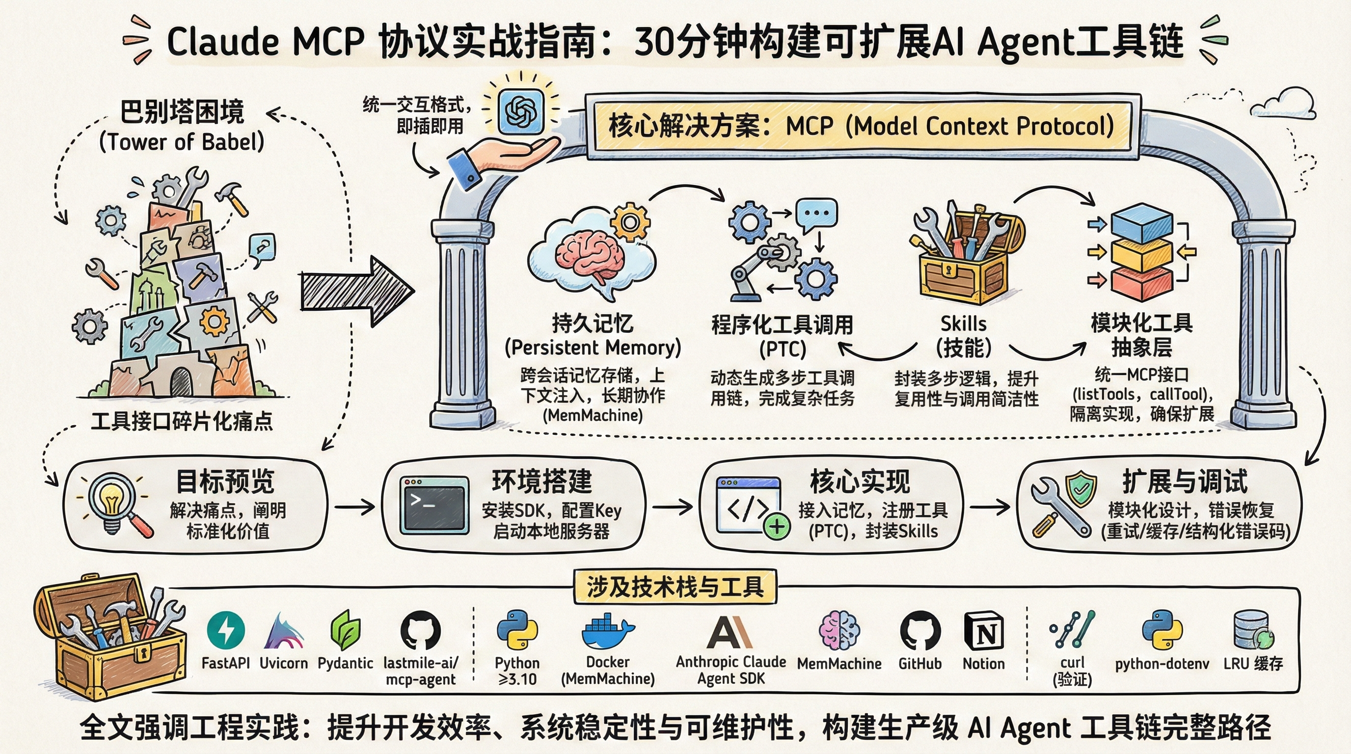 AI Agent 开发长期受困于工具接口碎片化------每个新服务都需要定制适配器,形成'巴别塔困境'。Model Context Protocol(MCP)作为标准化通信协议,正在重塑这一局面。本文以'30 分钟交付可运行工具链'为目标,手把手教你从零搭建支持持久记忆、程序化工具调用(PTc)和 Skills 的 MCP 工作流,并覆盖本地开发、错误处理与模块化扩展等实战缺口。