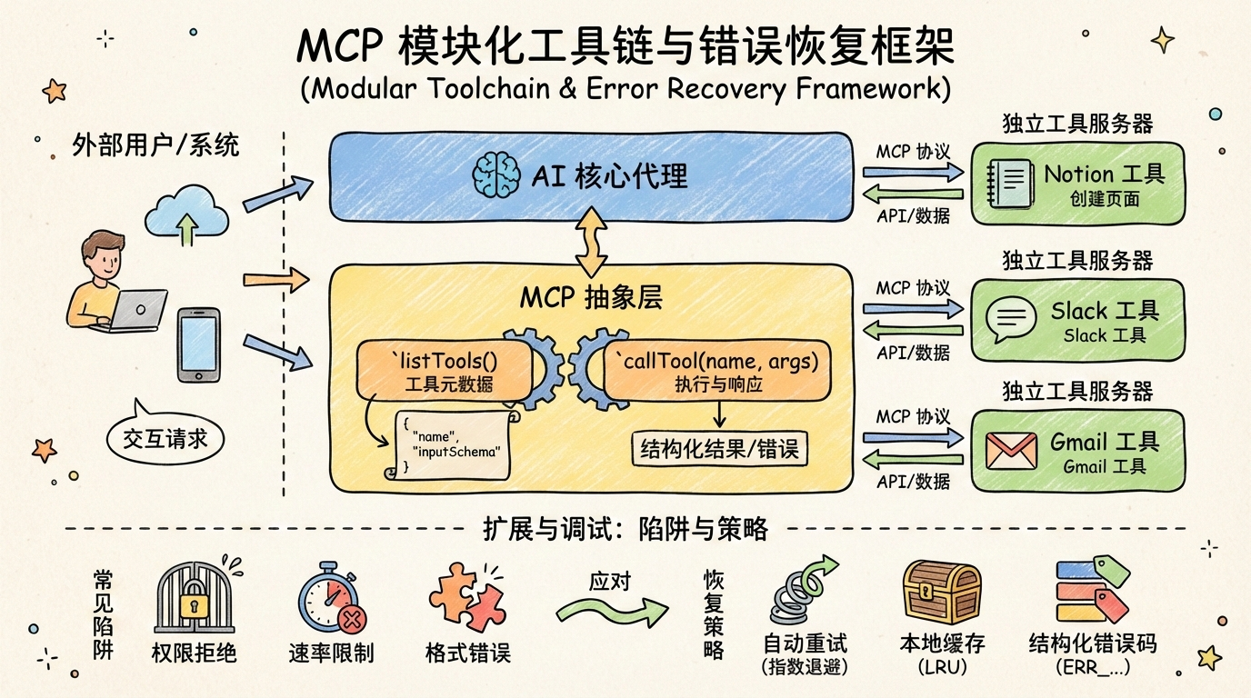 MCP 本质是"AI 模型与工具之间的通信协议",作用是规范工具的定义、调用和响应格式,让不同的工具能无缝对接支持 MCP 的框架。为安全集成 Notion 等新工具,必须构建统一的工具抽象层:所有外部服务通过相同接口暴露能力,内部实现完全隔离。这种设计使新增工具仅需实现标准 MCP 方法,无需修改 Agent 核心逻辑。