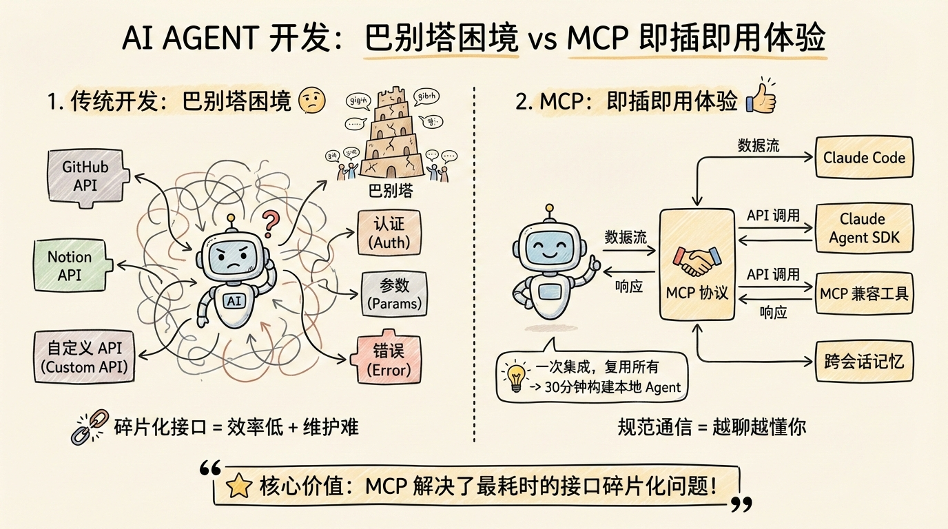 MCP 解决了 AI Agent 开发中最耗时的接口碎片化问题。