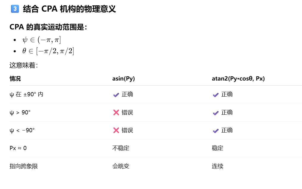 使用 atan2 函数完整象限判断的表达式:[ψ=atan2(Pycosθ,Px)] [ \psi = \operatorname{atan2}(P_y \cos \theta, P_x) ][ψ=atan2(Pycosθ,Px)]