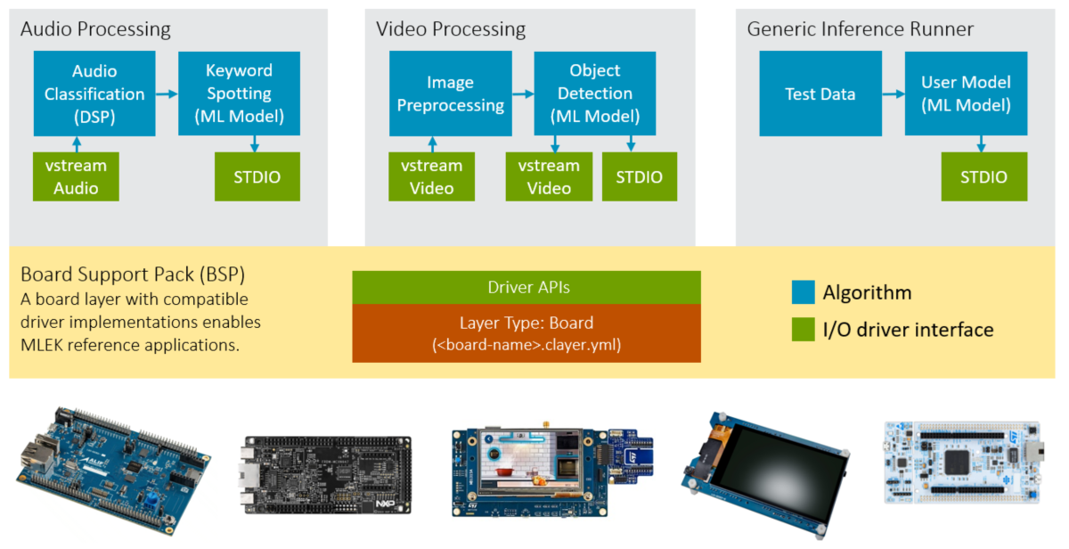 CMSIS-MLEK 软件包源自 Arm ML 嵌入式评估套件,其设计使示例更易于访问。该软件包同时包含物理硬件接口,简化了向目标硬件的移植过程。目前包含以下基于 TensorFlow Lite 格式神经网络的机器学习应用: