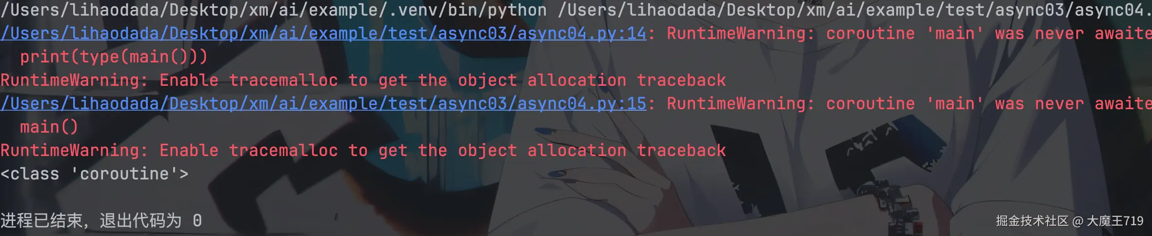 发现除了打印了类型外main执行直接就报错了: RuntimeWarning: coroutine 'main' was never awaited main() RuntimeWarning: Enable tracemalloc to get the object allocation traceback 报错的信息是协程没有使用await ,那我们加上await