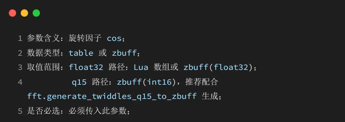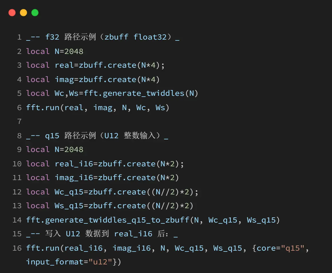 fft 模块提供高性能的快速傅里叶变换(FFT)和逆快速傅里叶变换(IFFT)功能,支持 float32 和 q15 定点两种内核,适用于信号处理、频谱分析等场景。
