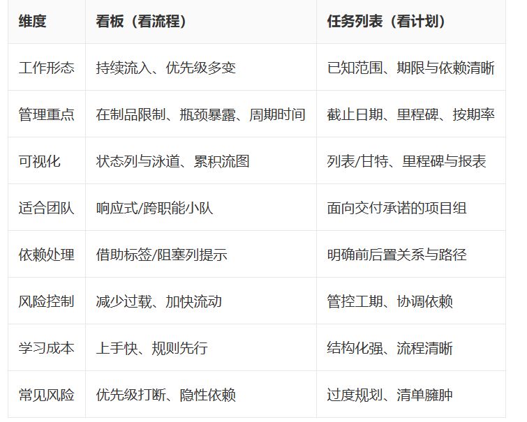 在解释层面,看板将复杂度前置于"流动规则" ,让小团队通过WIP与策略把复杂度"分时消化";任务列表将复杂度前置于"结构与依赖" ,让团队通过计划与分解在执行前把不确定性"框定"。两者并非对立,而是两种不同的认知切片:前者偏向"实时运营",后者偏向"按期交付"。小团队通常会在一个系统里切换视图,从而在不同会议或节奏下使用不同"看法"。