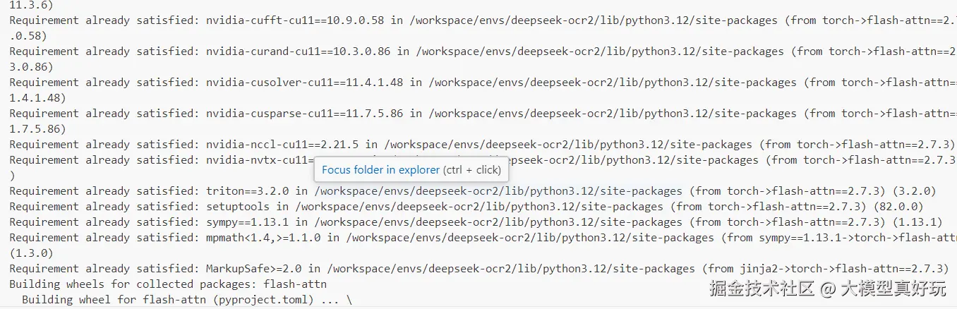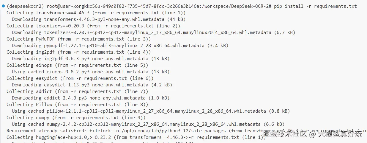 cd DeepSeek-OCR-2进入到git clone的目录文件夹下,执行pip install -r requirements.txt命令安装项目基础依赖,该步骤最后可能因某些依赖版本冲突而报错 (如pydantic或transformers版本),不影响核心功能,可忽略.