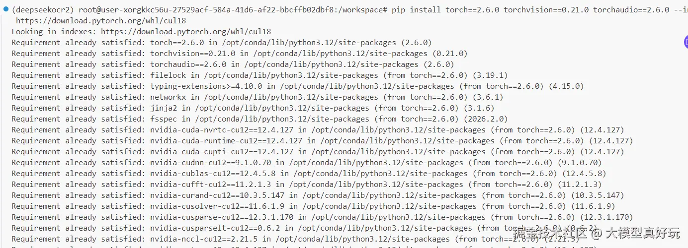 deepseekocr2虚拟环境中安装指定版本的 PyTorch(必须与 CUDA 11.8 匹配):pip install torch==2.6.0 torchvision==0.21.0 torchaudio==2.6.0 --index-url https://download.pytorch.org/whl/cu118