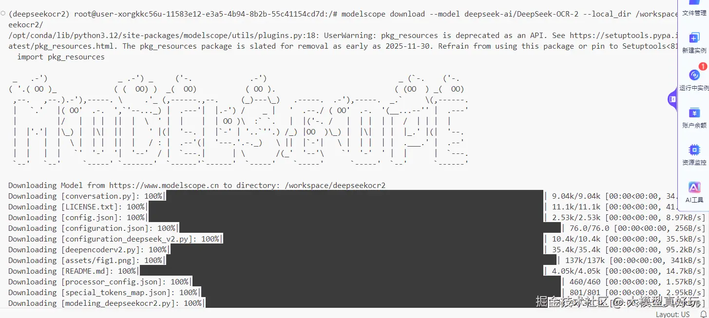 modelscope快速下载模型:bashconda create -n deepseekocr2 -y conda activate deepseekocr2 pip install -U modelscope mkdir /workspace/deepseekocr2 modelscope download --model deepseek-ai/Deepseek-0CR-2 --local_dir /workspace/deepseek-ocr-2