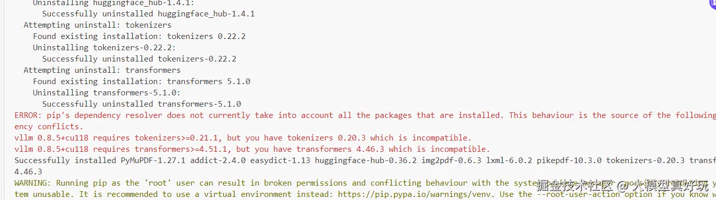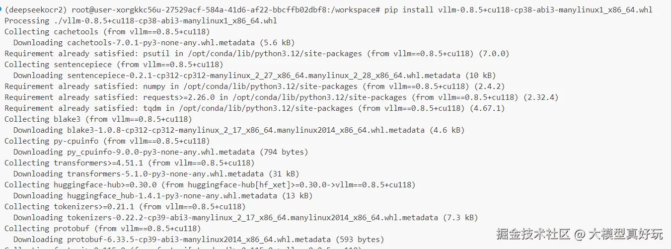 pip install vllm直接安装,否则推理效率会大幅下降。编译完成的包笔者已经帮助大家下载下来了,大家可以关注同名微信公众号: 大模型真好玩 , 并回复deepseek-ocr-2 获得whl文件,然后将该whl文件拖到服务器workspace目录下,最后执行pip install vllm-0.8.5+cu118-cp38-abi3-manylinux1_x86_64.whl
