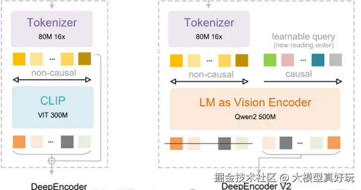 DeepSeek-OCR-2 的核心突破,源自其开创性的 视觉因果流(Visual Causal Flow) 技术。它以 Qwen2-0.5B 为底座,训练出全新的视觉编码器 DeepEncoder V2 ,使OCR模型首次具备了类似大语言模型的因果推理能力。