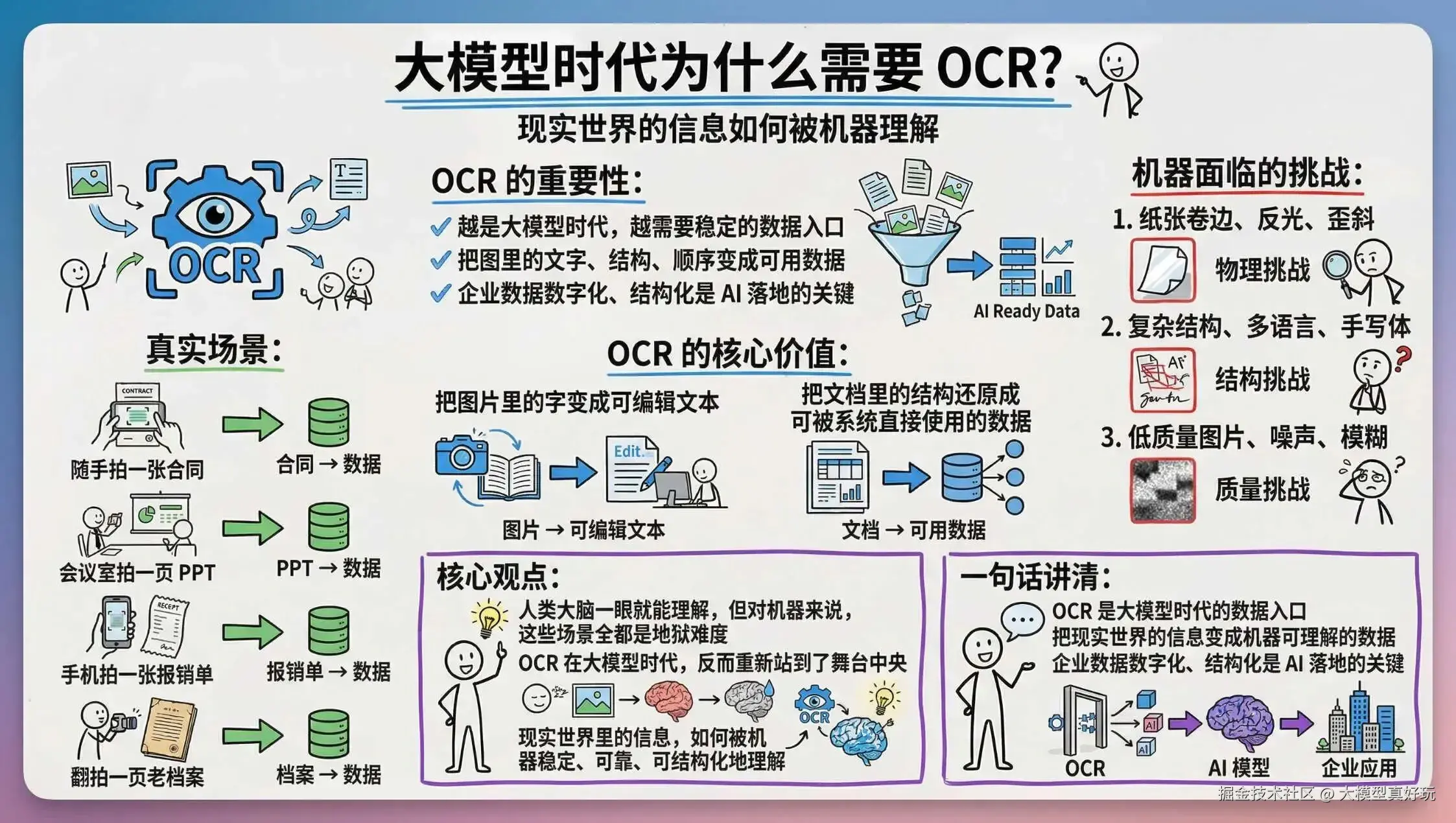 很多人对OCR的理解仍停留在几个经典场景:扫描件转Word、PDF文字提取失败、发票识别等。这些用途没错,但只说对了一半。真正的OCR,从来不只是"把字读出来"这么简单 。做过企业级AI落地服务的从业者大都深有体会:难的不是AI应用本身,而是企业数据的数字化与结构化。而OCR,正是打通物理世界与数字世界的第一道闸门。正因如此,在大模型时代,OCR非但没有被边缘化,反而重新回到了技术舞台的中央。准确率足够高的OCR工具,已经成为高质量数据集构建的底层支柱之一。