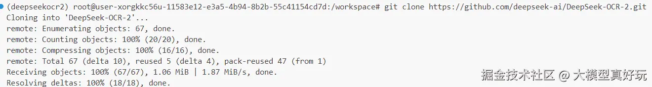 workspace目录下执行命令git clone https://github.com/deepseek-ai/DeepSeek-OCR-2.git克隆官方项目仓库,仓库中包含后续要用到的所有推理脚本与工具类,接下来笔者也会用它的项目包进行文件的转换: