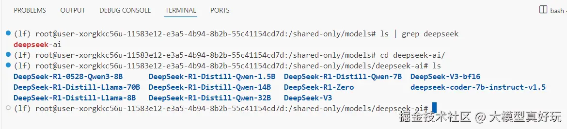 查看预置模型(可选) : Lab4AI平台非常贴心在大家启动的实例中预置了部分常用模型。可以在 VS Code 终端的命令行中执行