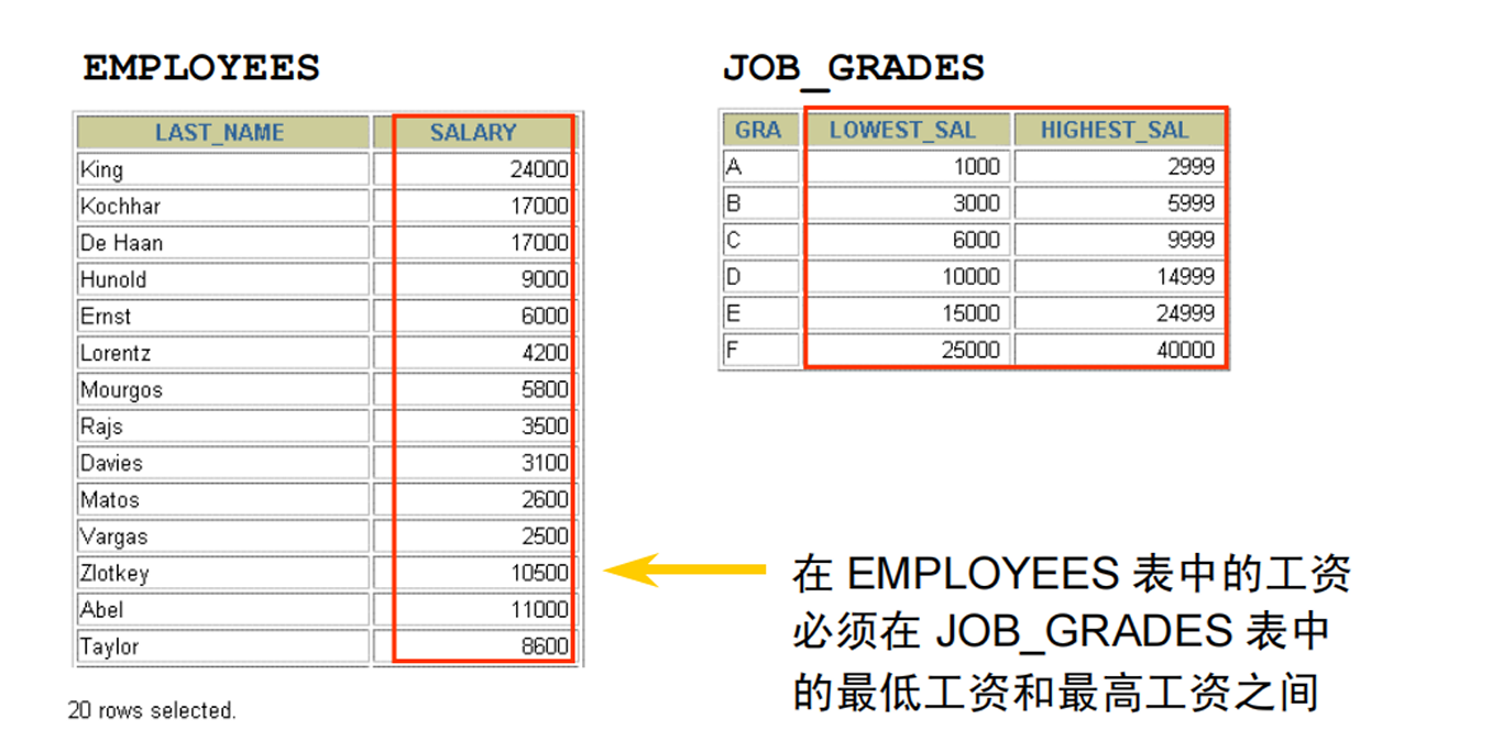 一个非等值连接是一种不同于等值操作的连接条件。 EMPLOYEES 表 和JOB_GRADES A 表之间的关系有一个非等值连接例子。在两个表之间的关系是EMPLOYEES 表中的 SALARY 列必须是 JOB_GRADES 表的 LOWEST_SALARY 和HIGHEST_SALARY 列之间的值。使用不同于等于 (=) 的操作符获得关系。