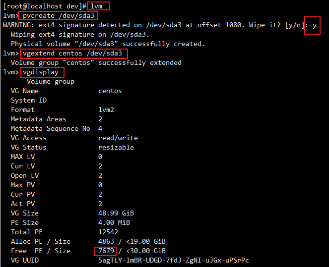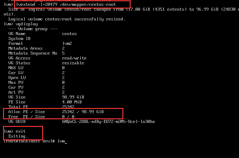 扩展已有卷的容量(下面的参数值为free PE /Site的值)
