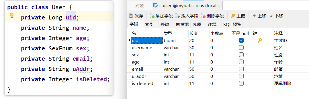 - 变量名驼峰转下划线为表的字段名(例如:属性uAddr → 表中字段名为u_addr)