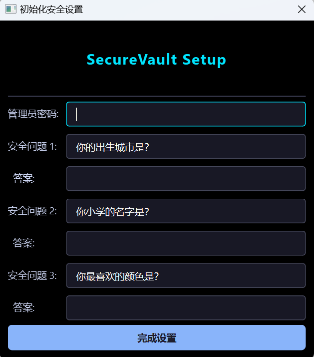 这俩密码(管理员密码和安全问题)都是防你万一忘了打不开软件的,设好了一定得记牢密码和问题答案,别回头抓瞎。