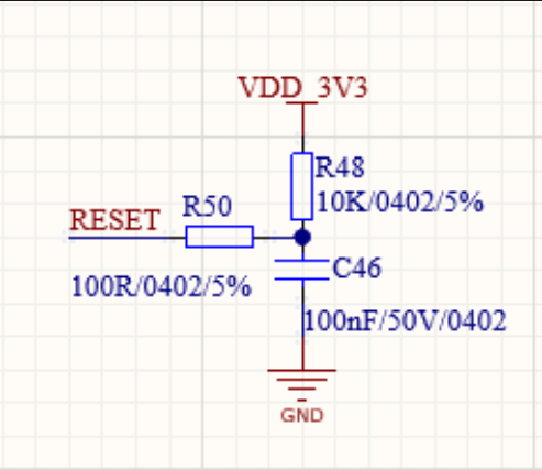 RESET引脚时,低电平通过 R50 向 C46 放电,使复位节点电压降低,再次触发复位。 - 放电完成后,C46 重新通过 R48 充电,恢复正常运行状态。