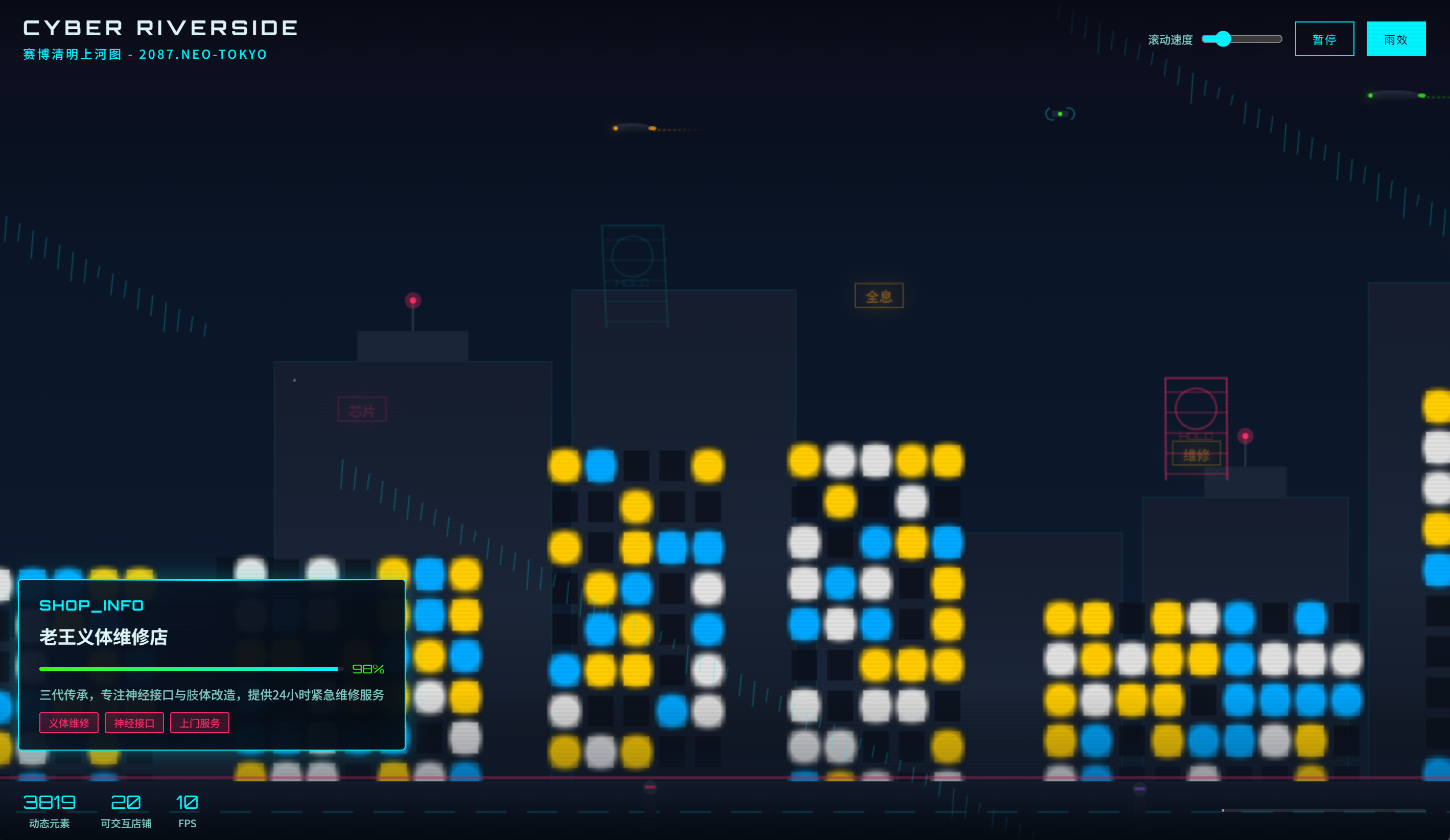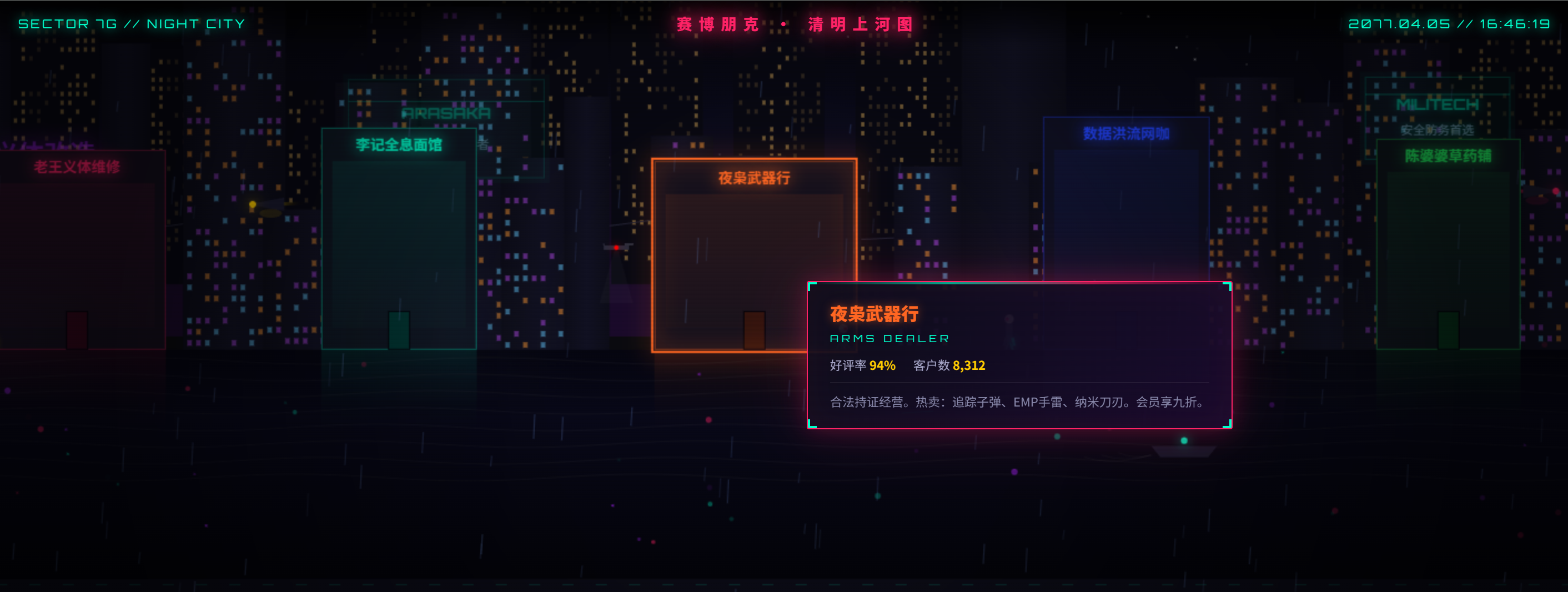 3. 鼠标悬停在任意店铺上时,要弹出一个赛博风格的信息卡片(如“老王义体维修店 - 好评率 98%”)。