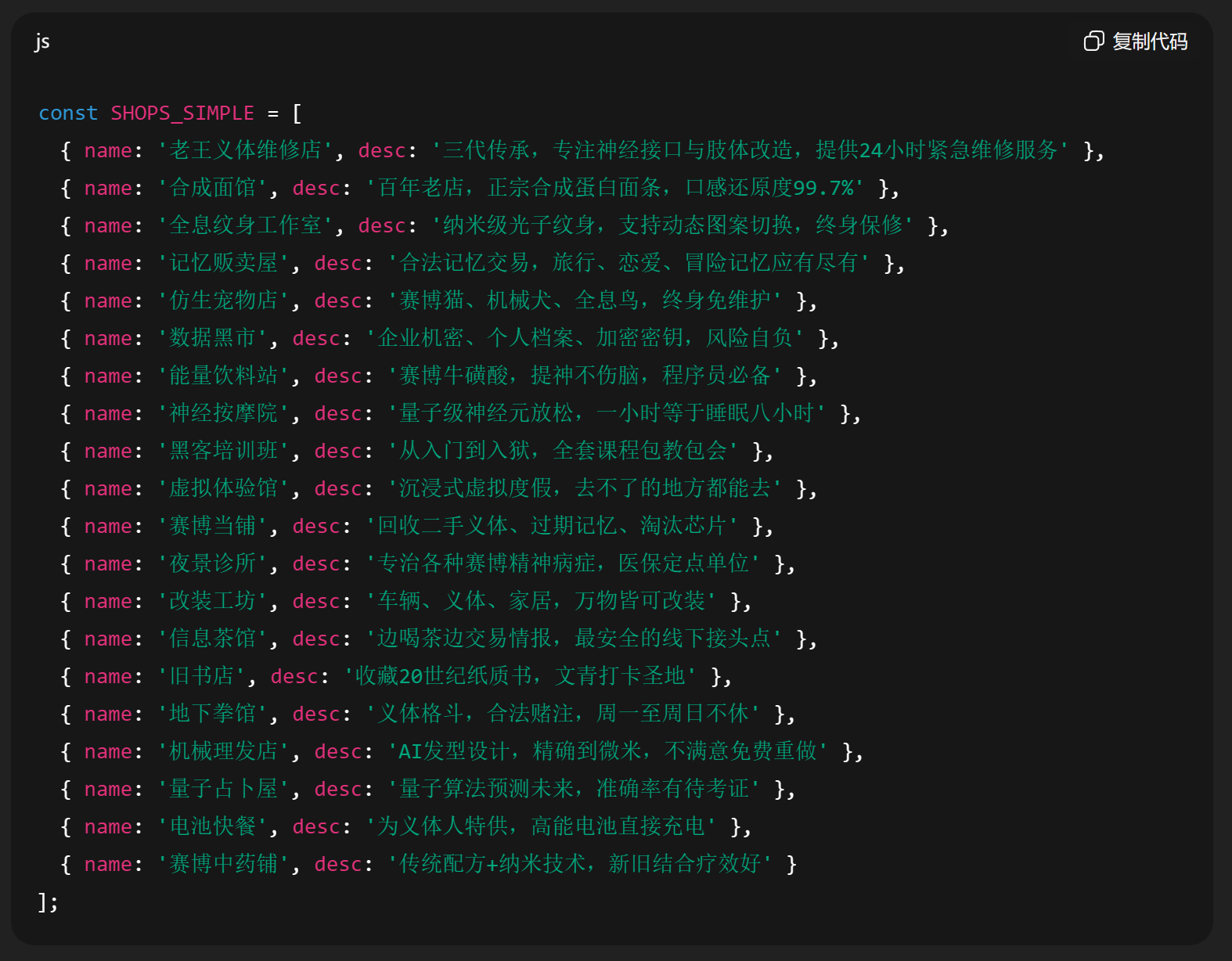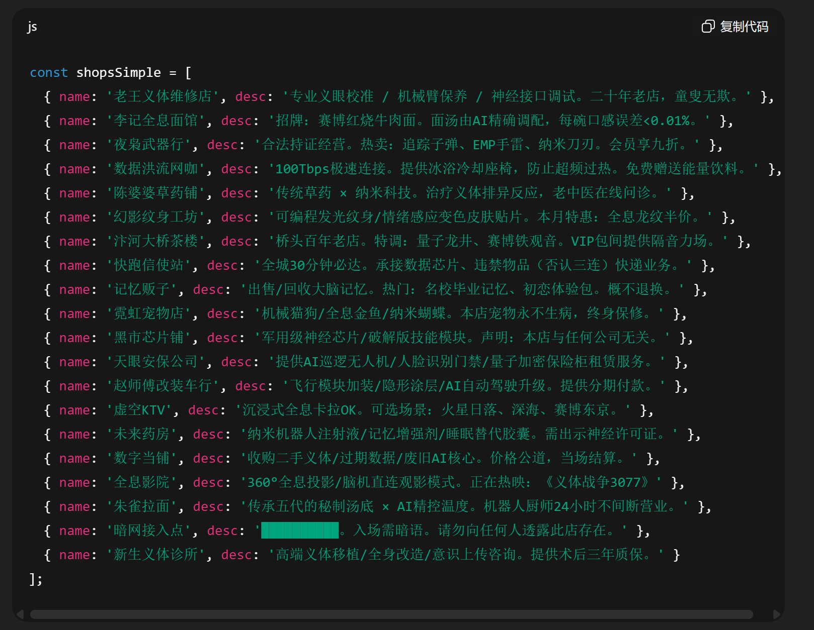 这里还有一个很有意思的点,他们都开了 20 家店铺,这是约好的么?然后里面的店铺名字和介绍,也很有意思。