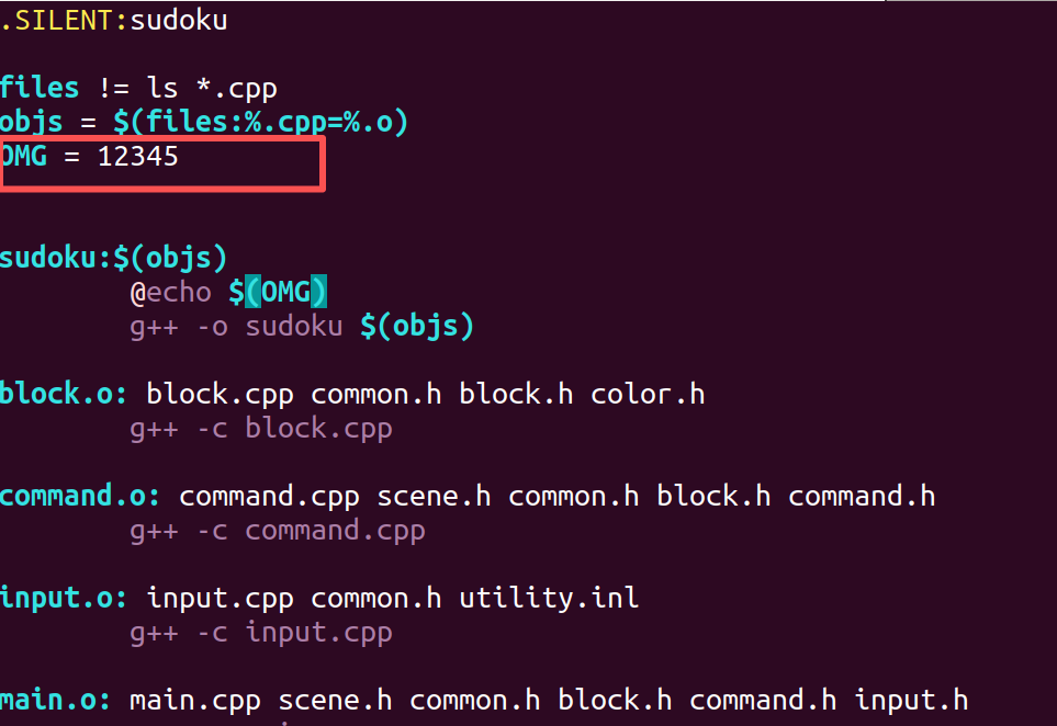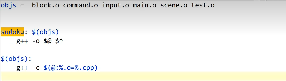 block.o : common.h input.o : common.h scene.o : common.h生成(更新)目标的方法写法一样的,只是依赖与目标不一样时。之前写的Makfile中,有如下代码: