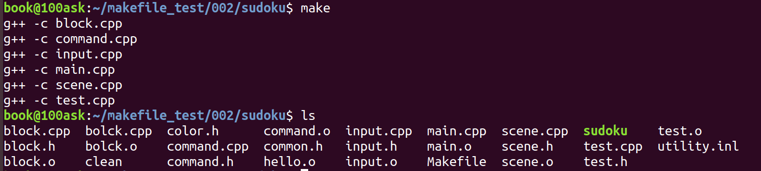 block.o: block.cpp common.h block.h color.h g++ -c block.cpp command.o: command.cpp command.h scene.h g++ -c command.cpp input.o: input.cpp common.h utility.inl g++ -c input.cpp main.o: main.cpp scene.h input.h test.h g++ -c main.cpp scene.o: scene.cpp common.h scene.h utility.inl g++ -c scene.cpp test.o: test.cpp test.h g++ -c test.cpp所有.o文件的生成都用的同一方法