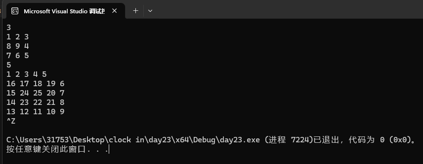 明明回家后想自己动手构造这样的螺旋方阵。他从n=1开始构造,但是他发现当n越来越大时,螺旋方阵的复杂性就越高,然后构造出来的方阵就越容易出错。为了降低构造方阵的出错率,提高构造速度,明明就求助于你,请你帮他写一个程序,来构造螺旋方阵。 明明的问题可以归结为:给你一个正整数n,请你按题目描述中所述的方法,构造出n阶的螺旋方阵。
