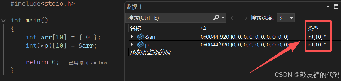 我们调试也能看到 &arr 和 p 的类型是完全一致的。